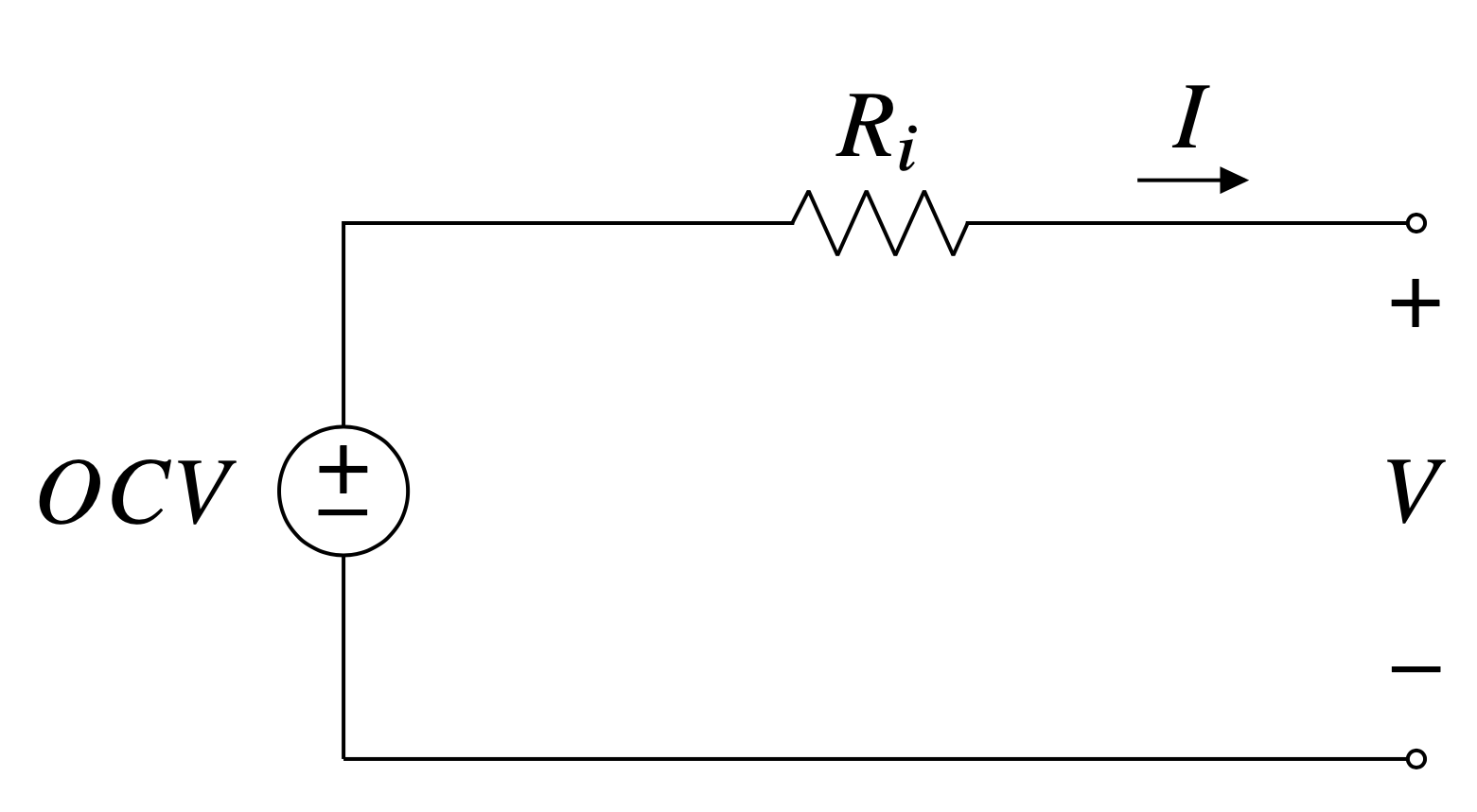 The potential across the voltage source is the cell’s open circuit voltage and the resistance is the cell’s internal resistance. Both the $OCV$ and the $R_i$ are functions of the cell depth of discharge - they depend on where you are in a cell’s discharge.